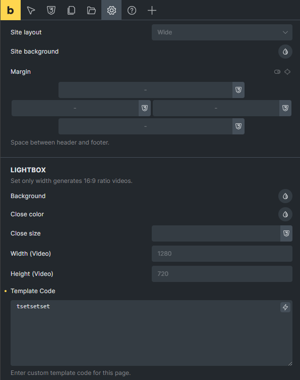 Adding a ‘template_code’ field to the builder’s page settings. It is unfiltered so you can add code or text it can be anything.