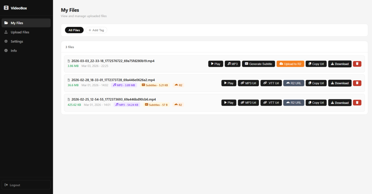 Upload, Encode MP3 with ffmpeg and php, whisper implementation for the subtitle generations and implemented Cloudflare R2 to sync my files and use the edge url instead of the soruce url.