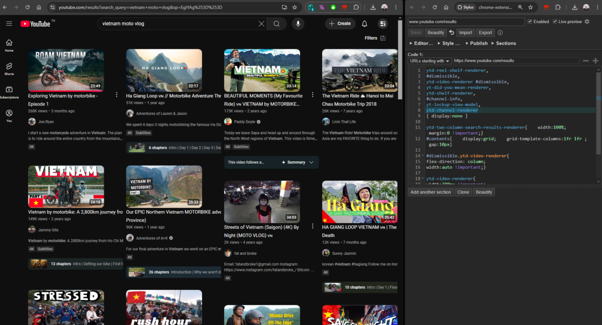 I use stylus extension to apply this css to youtube results. Easy and simple.