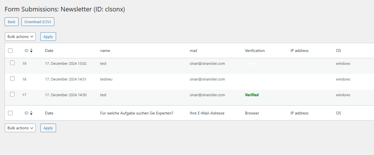 2 – verify function when someone clicks the link from confirmation mail that has /newsletter/?verify-my-mail={user_email} this changes to verified status for that mail submission
