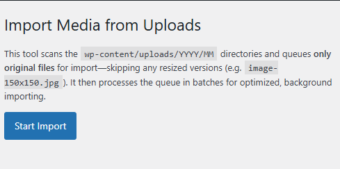 This tool scans the wp-content/uploads/YYYY/MM directories and queues only original files for import—skipping any resized versions (e.g. image-150x150.jpg). It then processes the queue in batches for optimized, background importing.