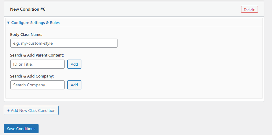 This code implements a custom WordPress administration system that allows users to assign specific CSS classes to the HTML body tag based on parent pages or taxonomy terms. It features a modern, repeater-style settings page where administrators can create multiple “Menu Conditions.” Each condition maps a custom class name to selected pages (including their descendants) or specific terms from a “company” taxonomy.
