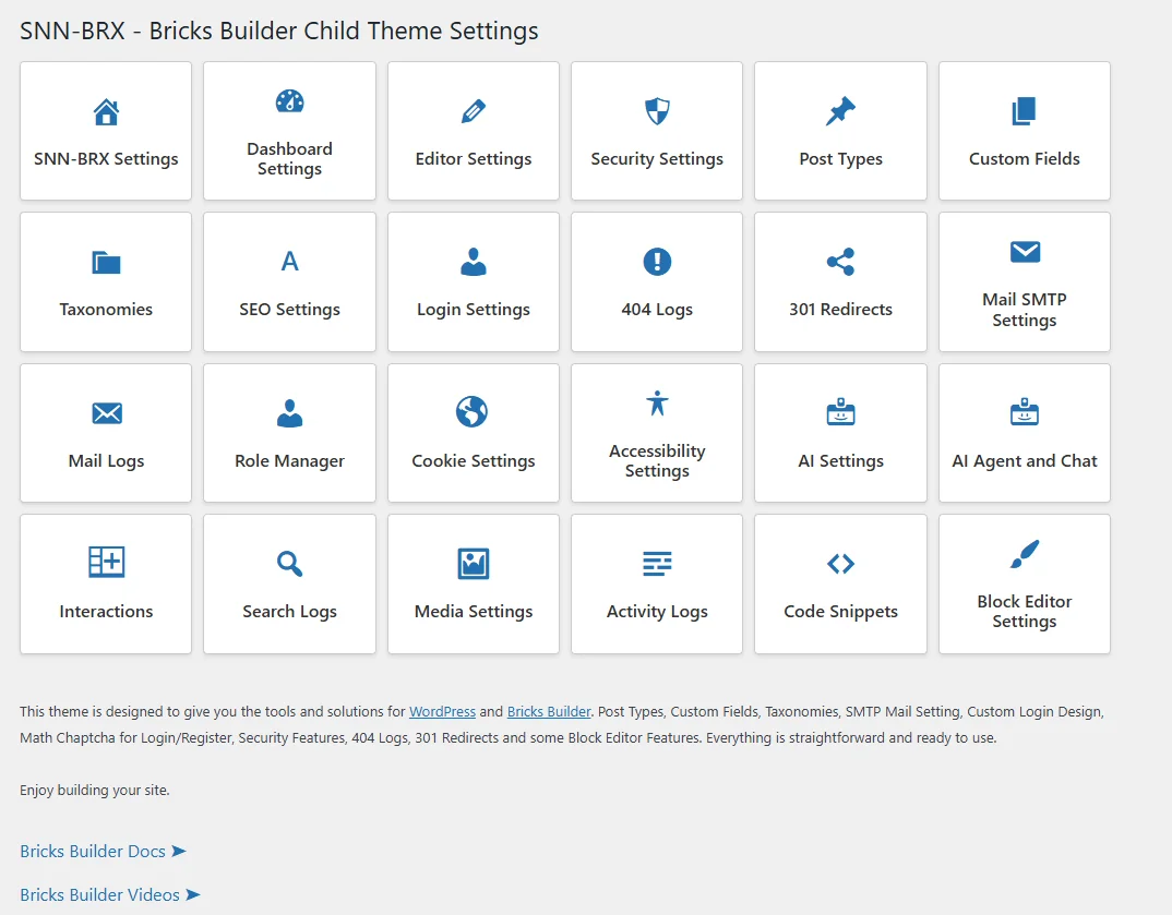 SNN-BRX is fully modular and conflict safe by design. Nothing is preloaded or forced unless you explicitly register post types, taxonomies, or custom fields inside the theme, it stays passive.